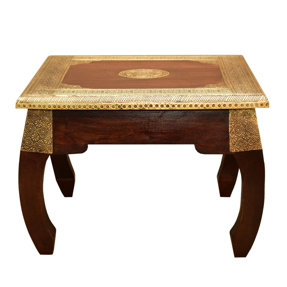Oriental side table Opium table Brass L is made of Indian mango wood, which has been elaborately carved . This coffee table has been carefully handcrafted in India. Elaborate metal applications adorn the tabletop.