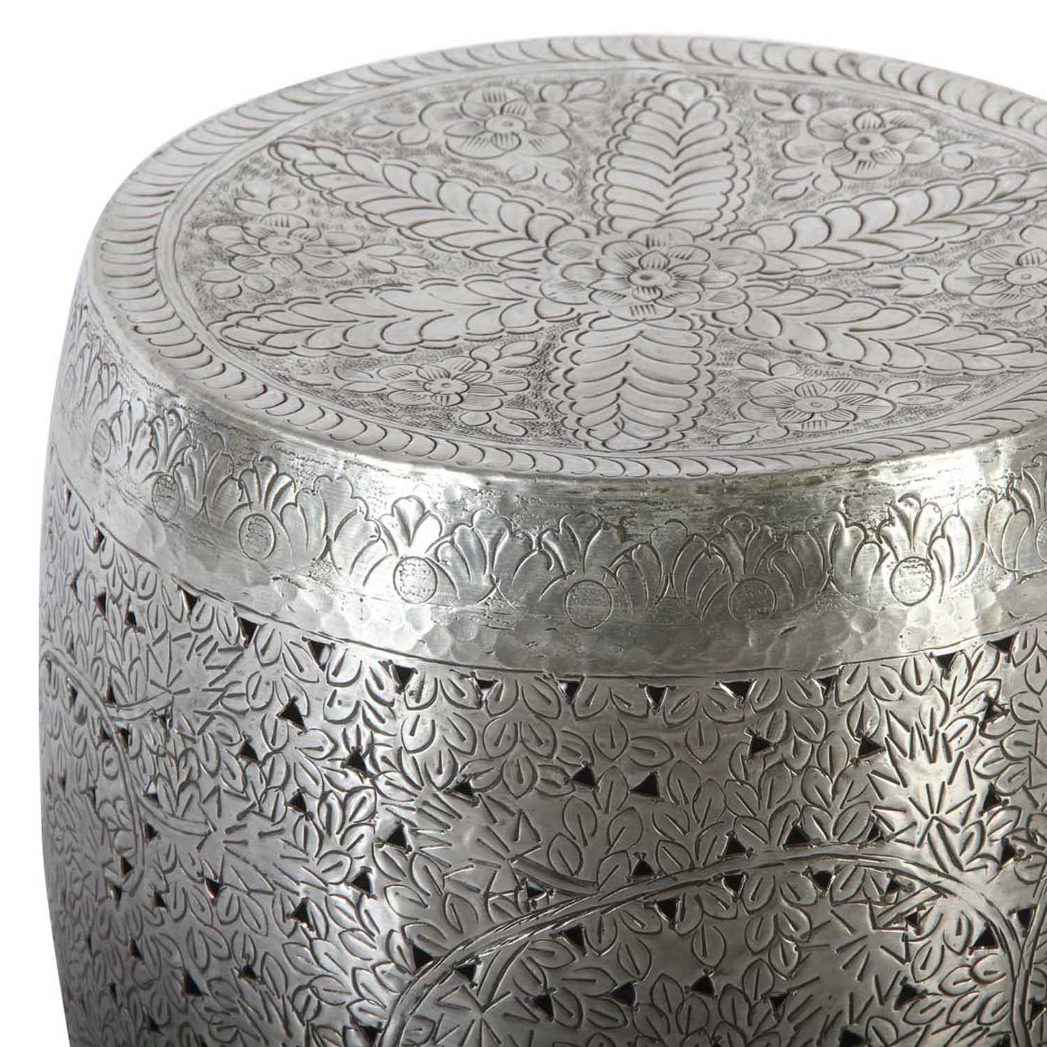 A high-quality stool/side table made of aluminum. A piece of furniture that you don't see every day. The silver-colored table looks particularly good in the living room as a stool or as a side table in the study or office. This piece of furniture is guaranteed to be a highlight and will be the eye-catcher in any room. The shiny side table/stool in a cylindrical shape with a hammered finish is a real eye-catcher. It can also be used as a side table, bedside table, storage table, plant stand, lamp stand, or telephone stand.